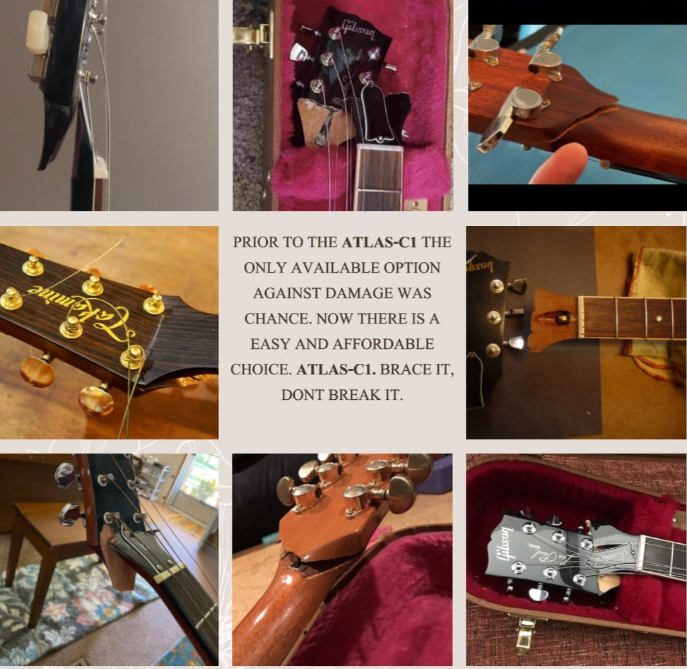 The Atlas C-1 is a stainless steel precision tool engineered to apply targeted mechanical pressure, countering the typical string force of 130–140 lbs. exerted at the vulnerable headstock/neck junction of (3-on-3) six-string guitars tuned to standard pitch (440Hz). When properly fitted, the Atlas C-1 creates a net force of zero, achieving static equilibrium exactly where it’s needed to provide comprehensive protection.