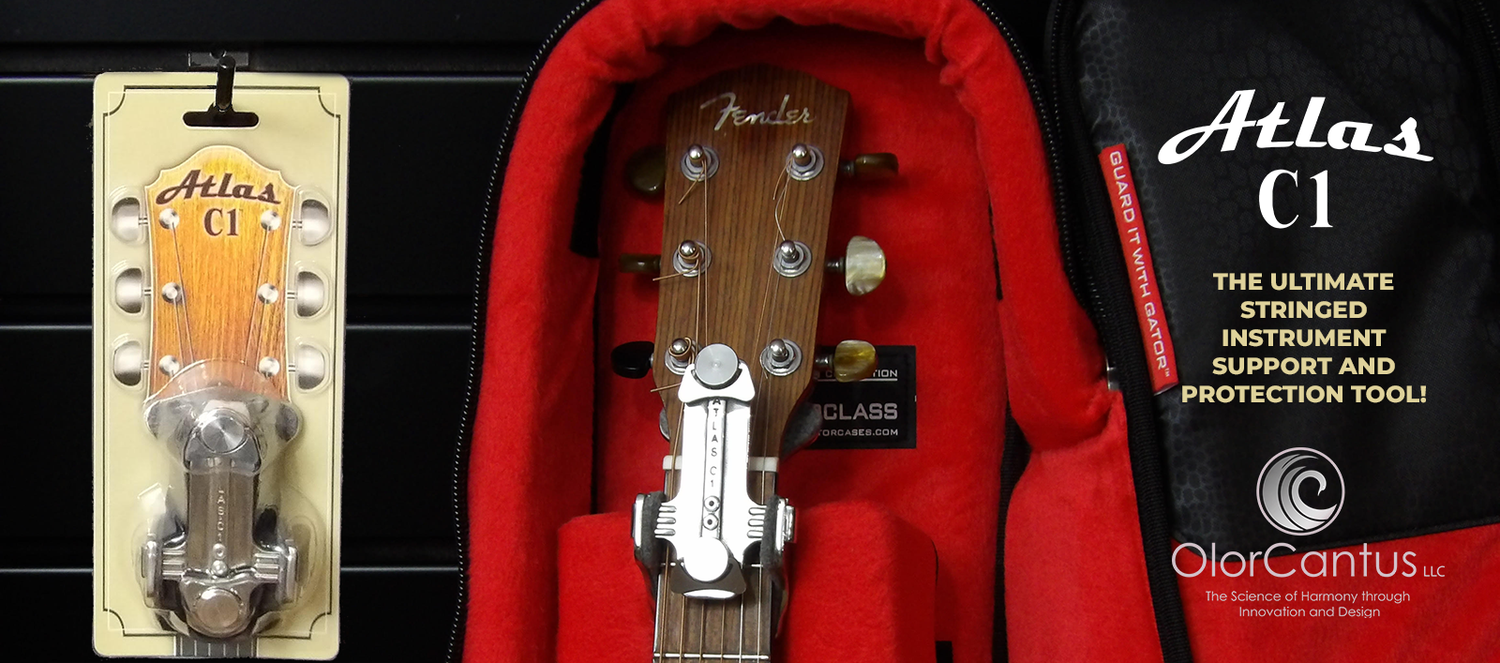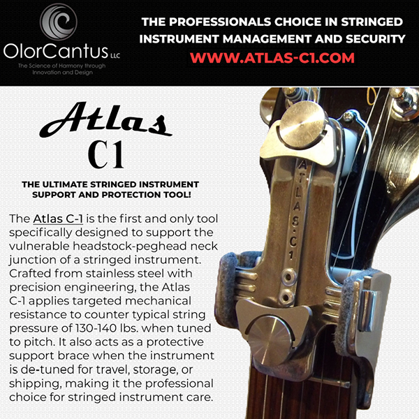 The Atlas C-1 is the first and only tool specifically designed to support the vulnerable headstock-peghead neck junction of a stringed instrument. Crafted from stainless steel with precision engineering, the Atlas C-1 applies targeted mechanical resistance to counter the typical string pressure of 130–140 lbs. when tuned to pitch. It also acts as a protective support brace when the instrument is de-tuned for travel, storage, or shipping, making it the professional choice for stringed instrument care.
