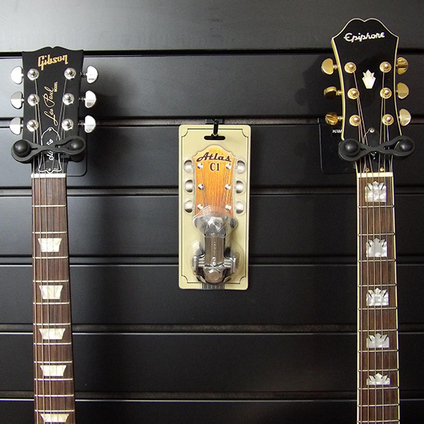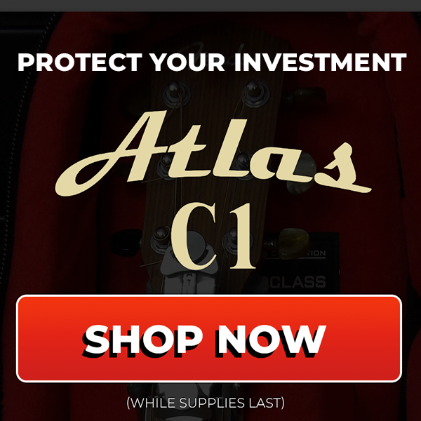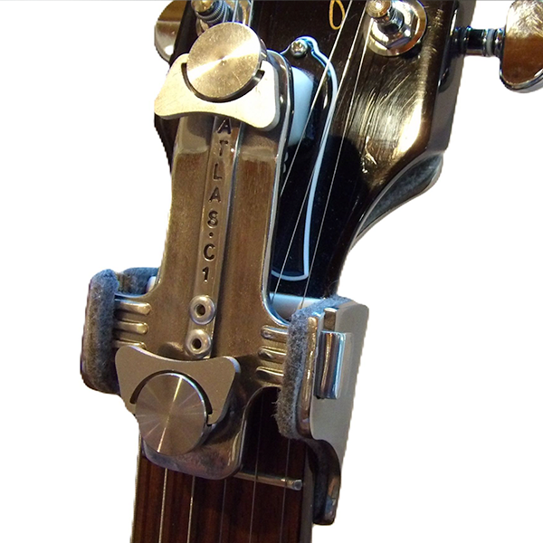 The innovative design of the Atlas C-1 accommodates all (3-on-3) six-string guitars with nut widths up to 50mm and break angles from 10 to 28 degrees. For full-time protection, it is recommended to keep the Atlas C-1 on the instrument when not in use—whether on a stand, with slackened strings, in storage, or during transport.