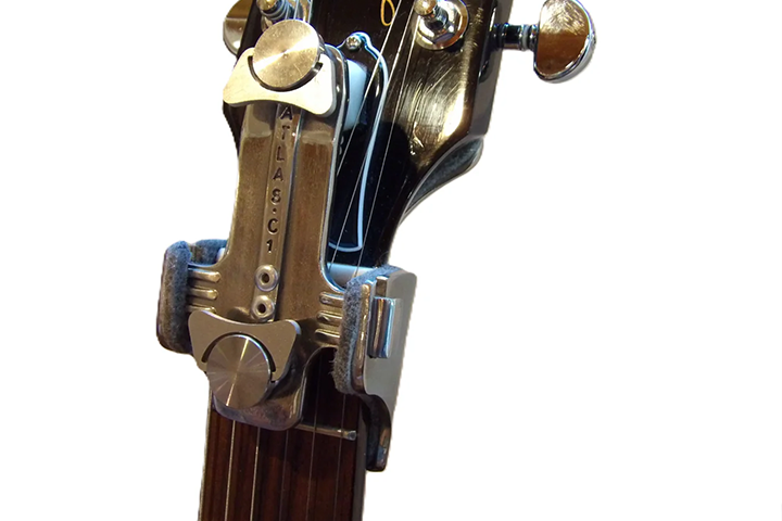 Position the Atlas C1 on the headstock-neck junction. Tighten by hand—no tools required.